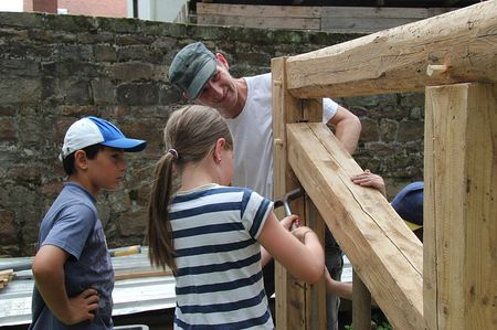 In der Zimmerei konnten die Kinder Fachwerk verbinden, Löcher bohren, selber sägen und Zapfen herstellen, die sie dann mit einem großen Holzhammer in die Balken einschlugen. Dabei lernten sie, die Gefahren des scharfen Werkzeugs einzuschätzen und sich umsichtig zu bewegen. Dafür sorgten Zimmermann Wolfgang Lonzek mit seiner Frau Ulla (Bad Karlshafen) und Ulrike Trappe (Bootsbauerin und Architektin, Lippoldsberg).
